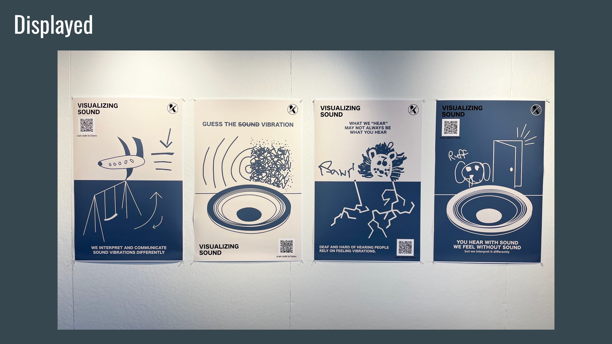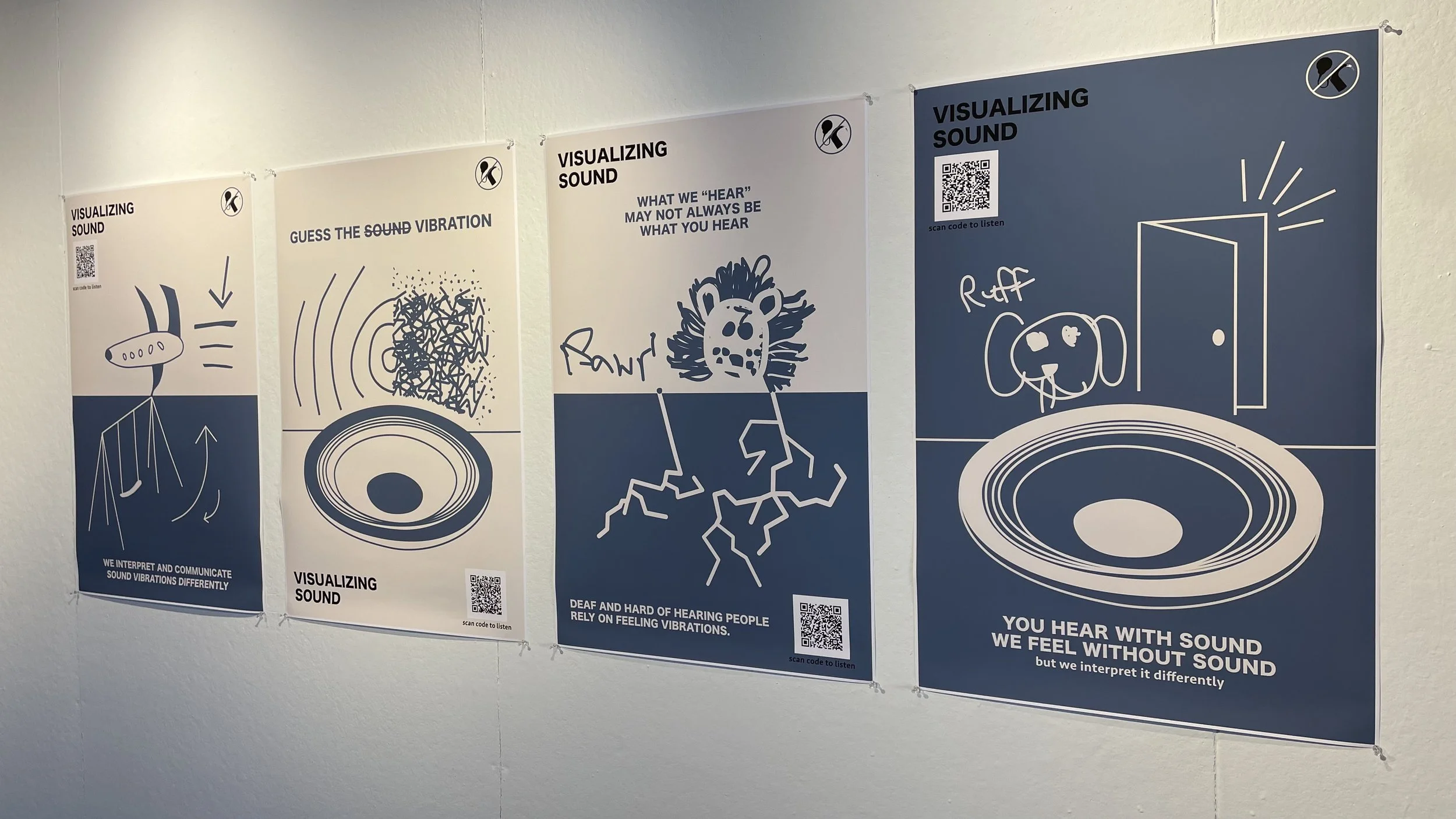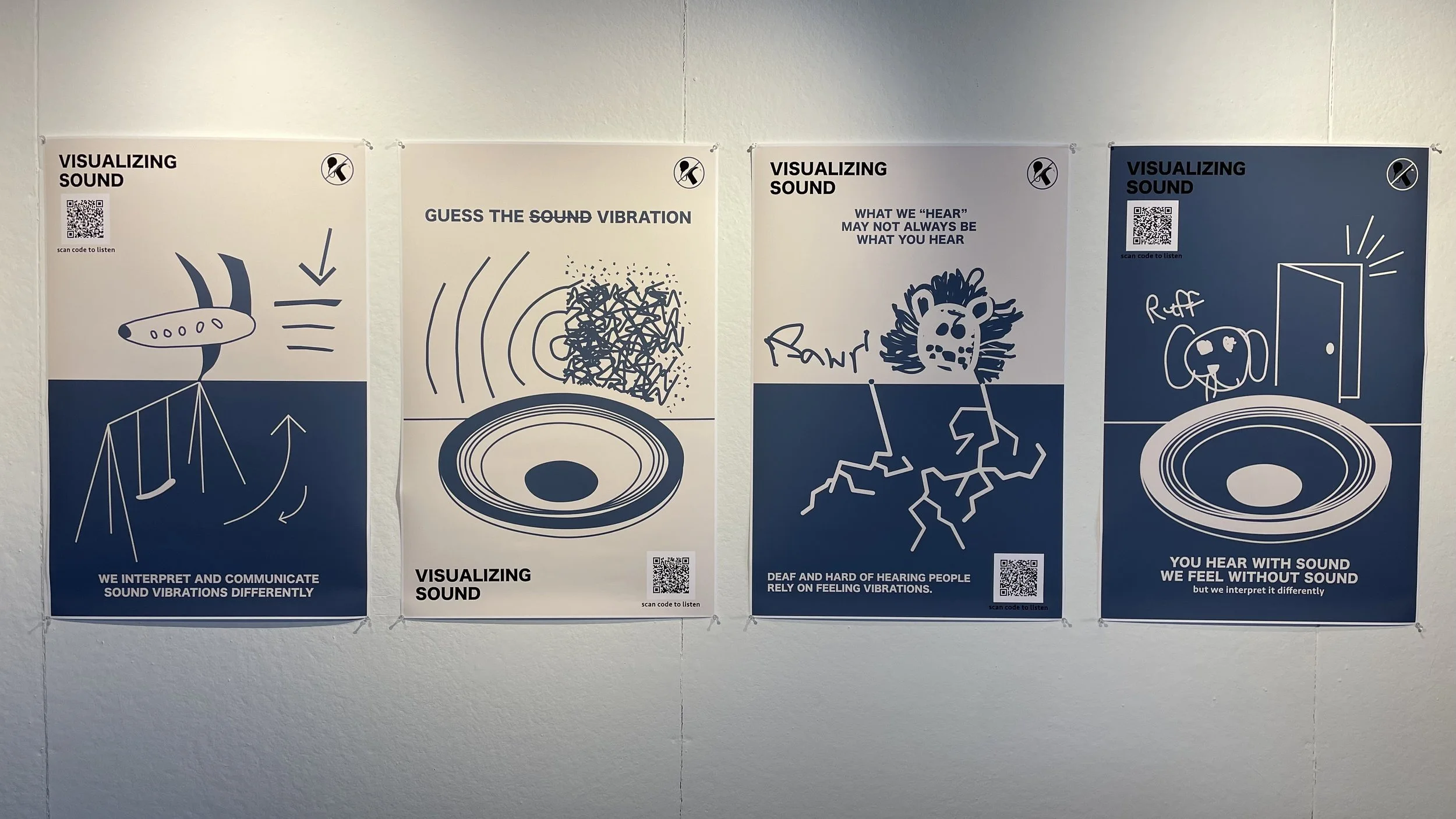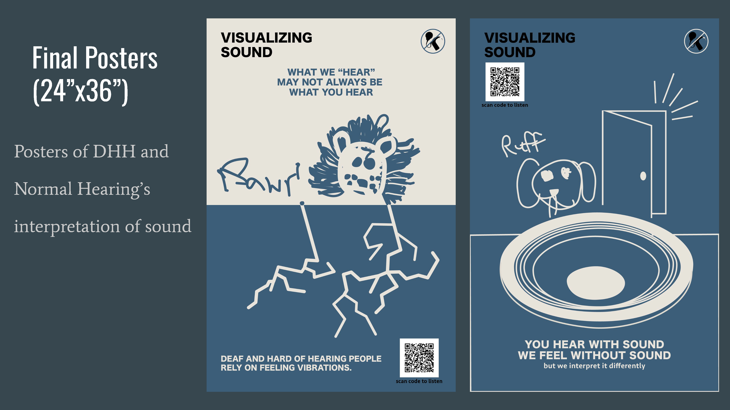 Visualizing Sound is a series of visual posters depicting the many different ways that DHH people interpret sound vibrations as well as comparing them to normal hearing people to inform the public about communication not always being the same interpretation for everyone.