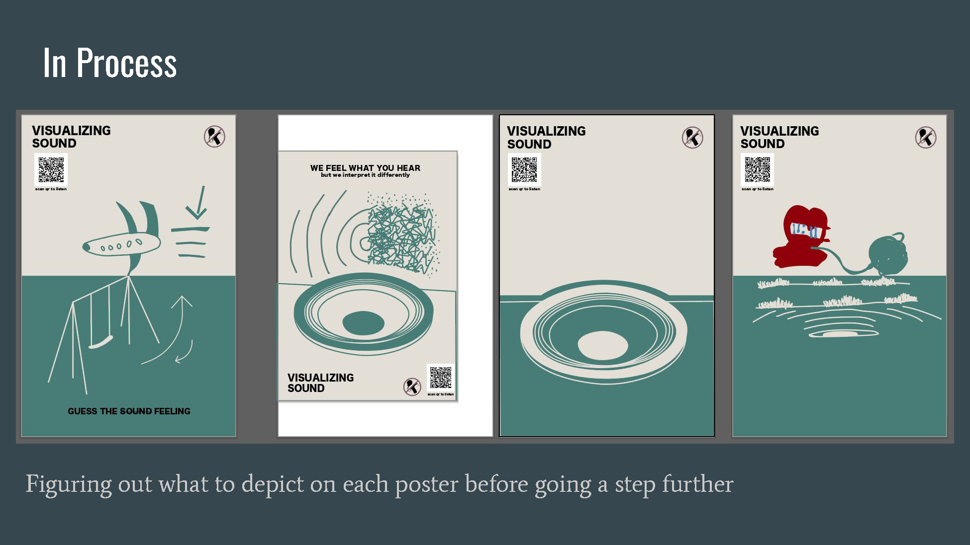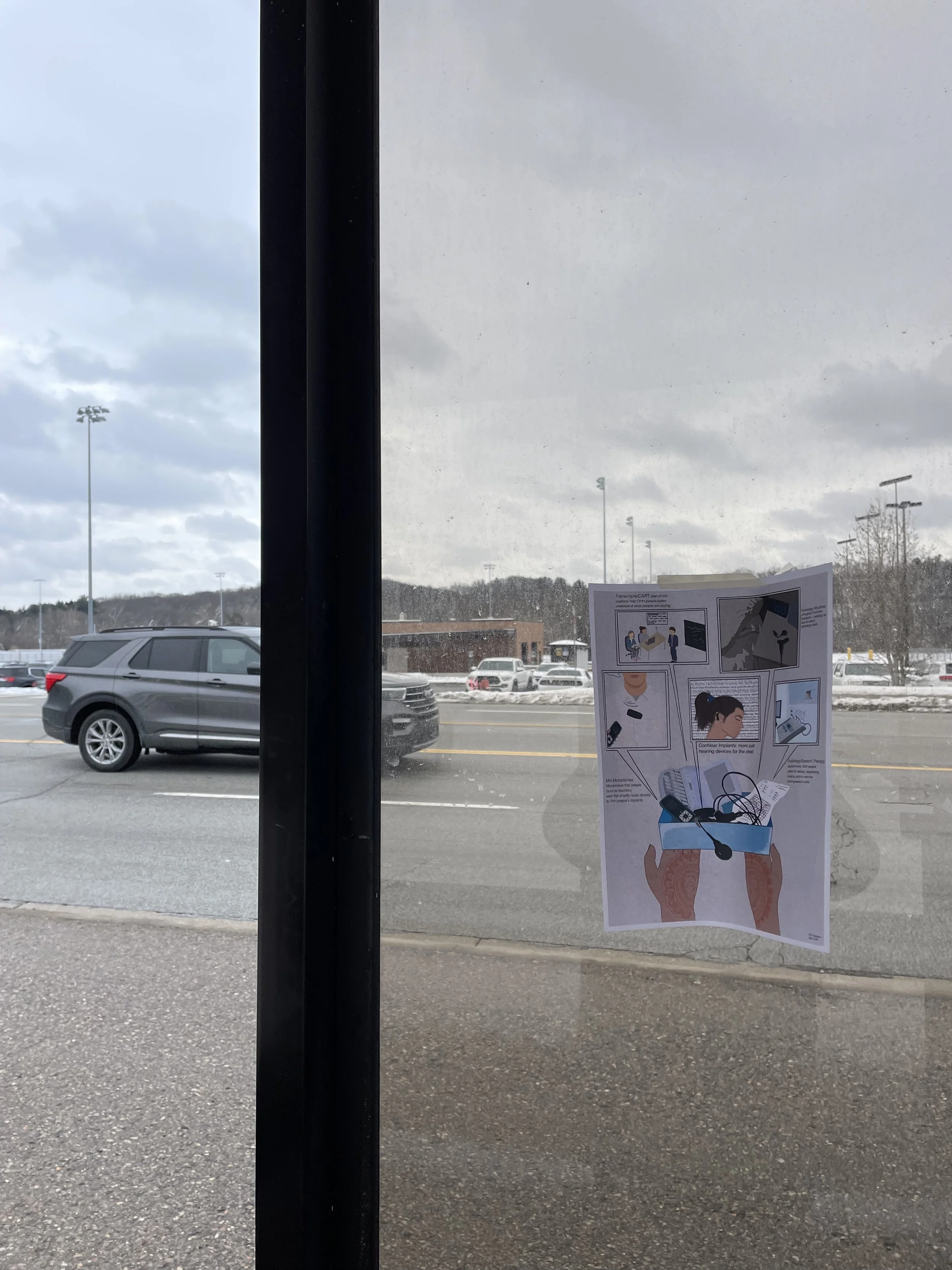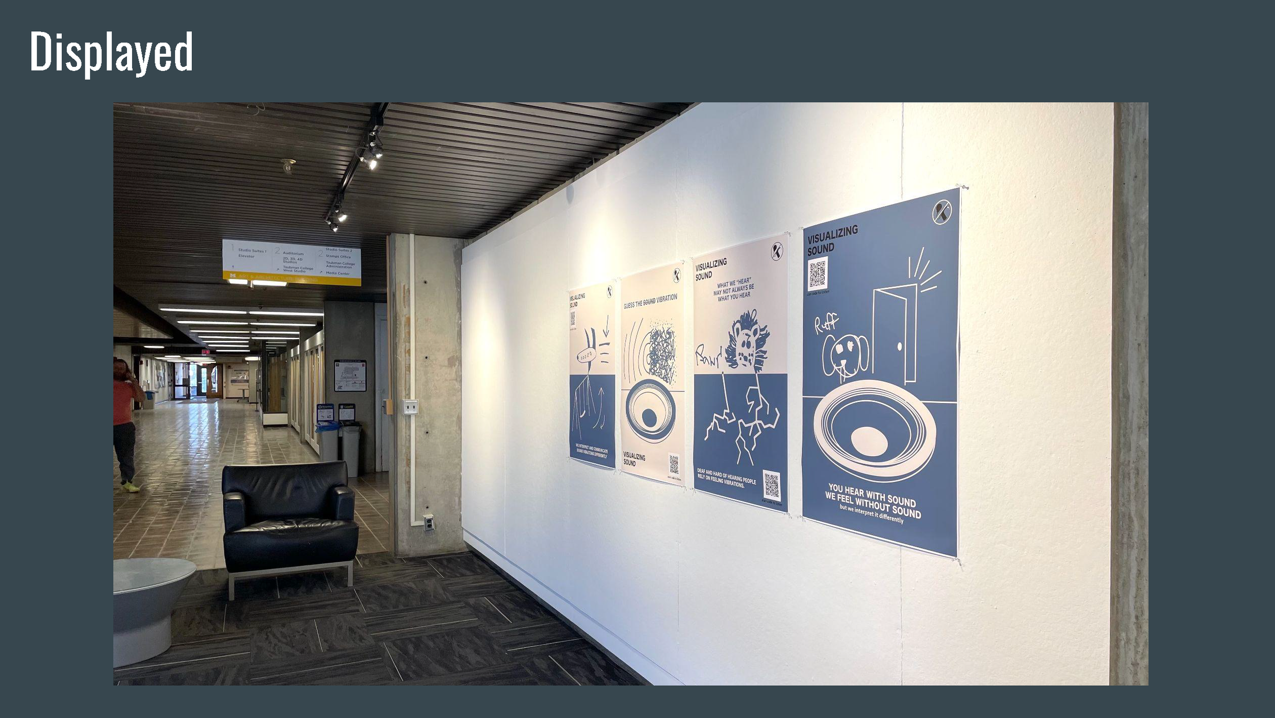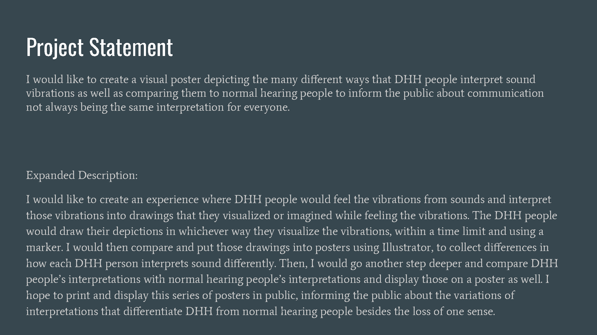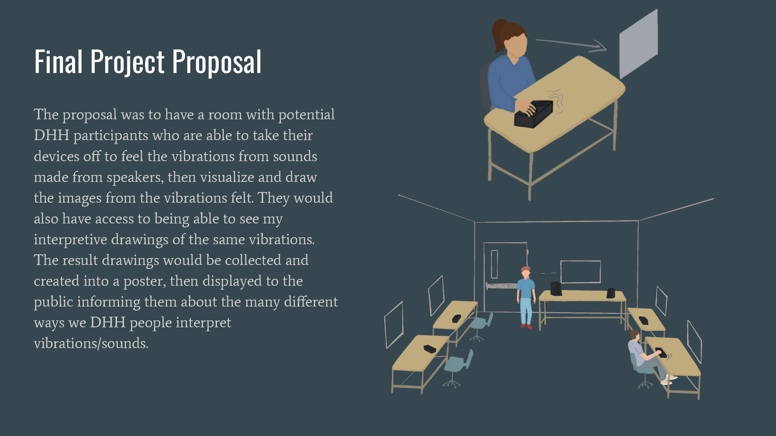 Visualizing Sound is a series of visual posters depicting the many different ways that DHH people interpret sound vibrations as well as comparing them to normal hearing people to inform the public about communication not always being the same interpretation for everyone.