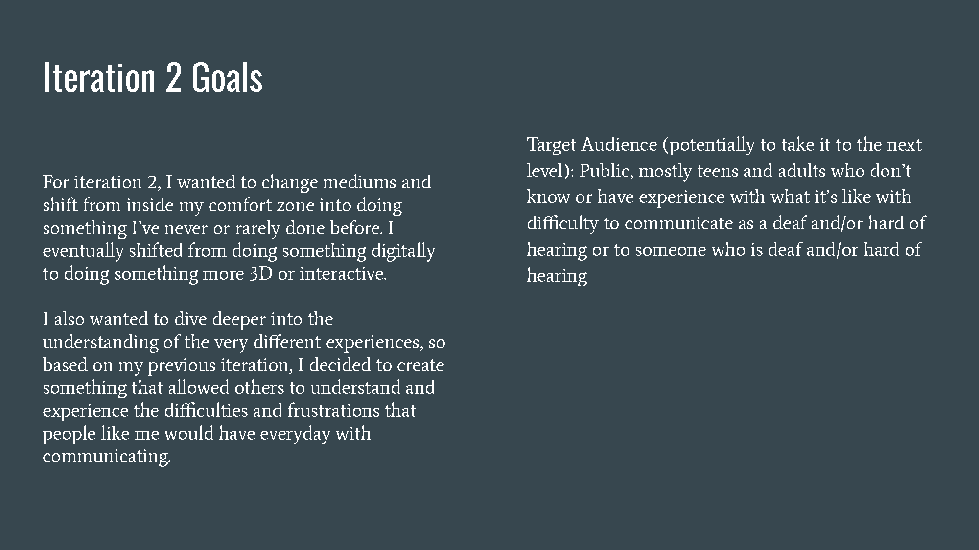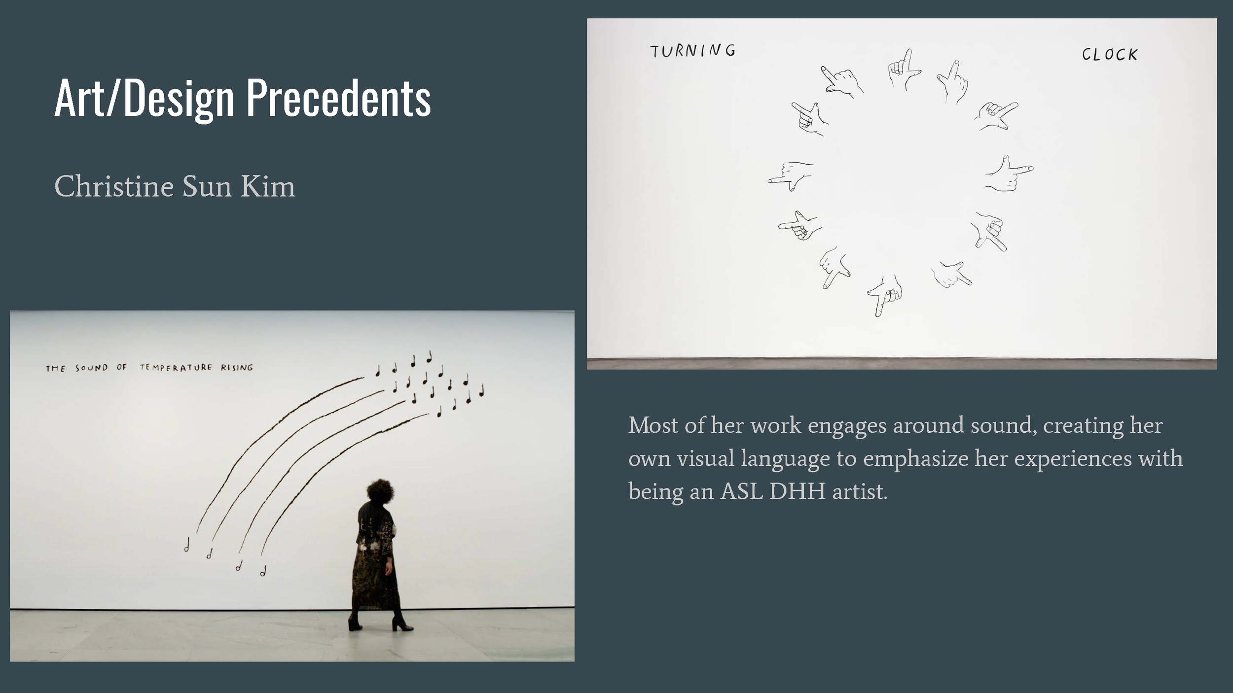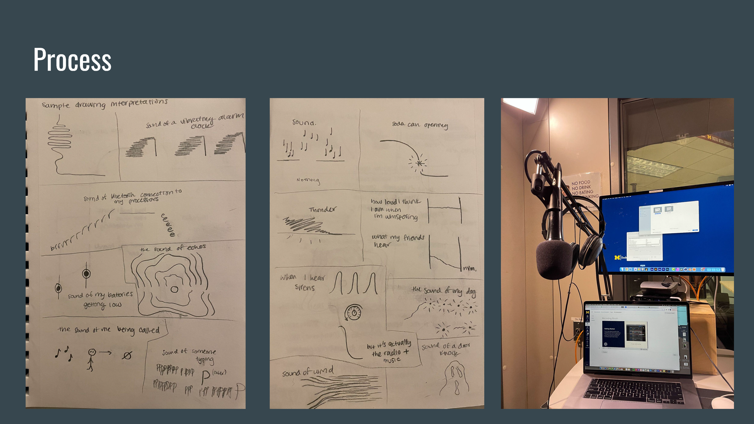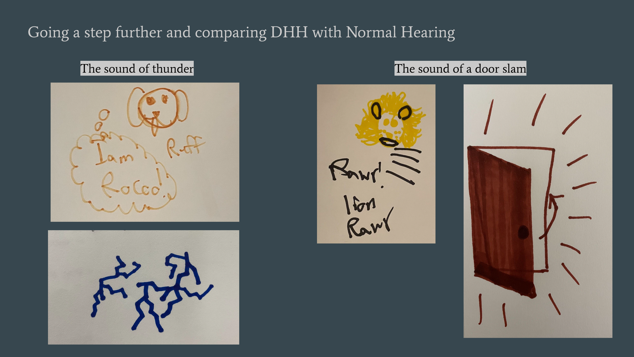 Visualizing Sound is a series of visual posters depicting the many different ways that DHH people interpret sound vibrations as well as comparing them to normal hearing people to inform the public about communication not always being the same interpretation for everyone.