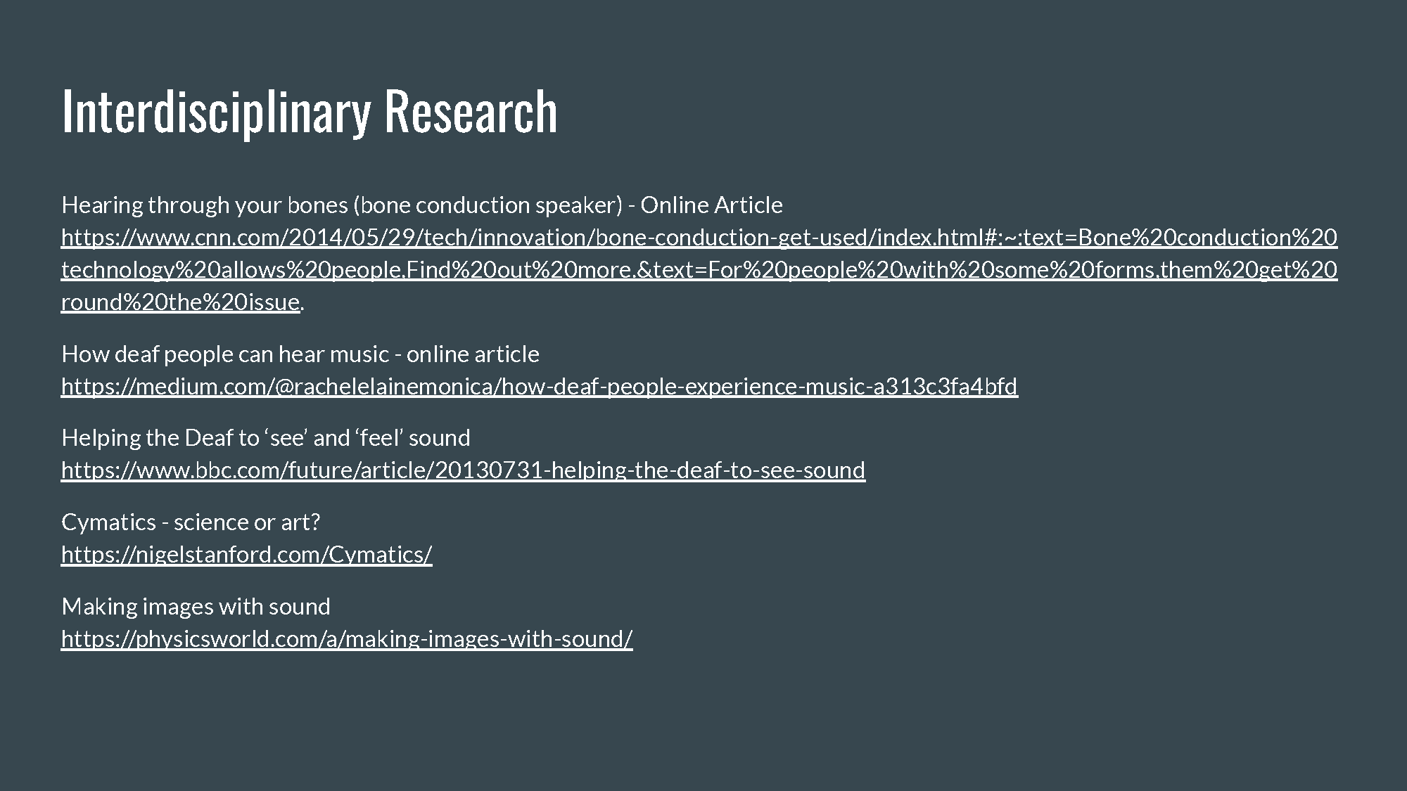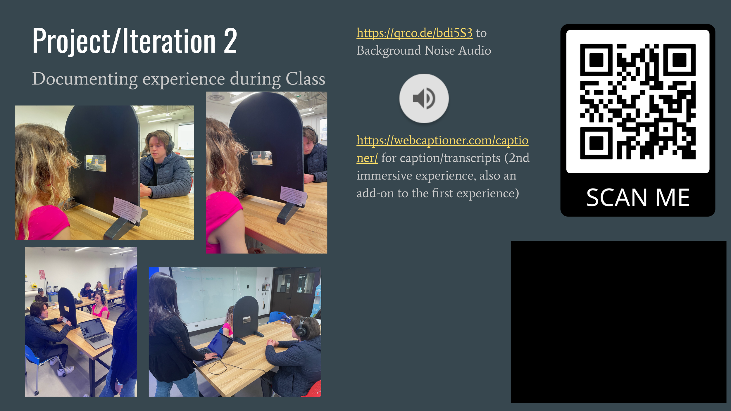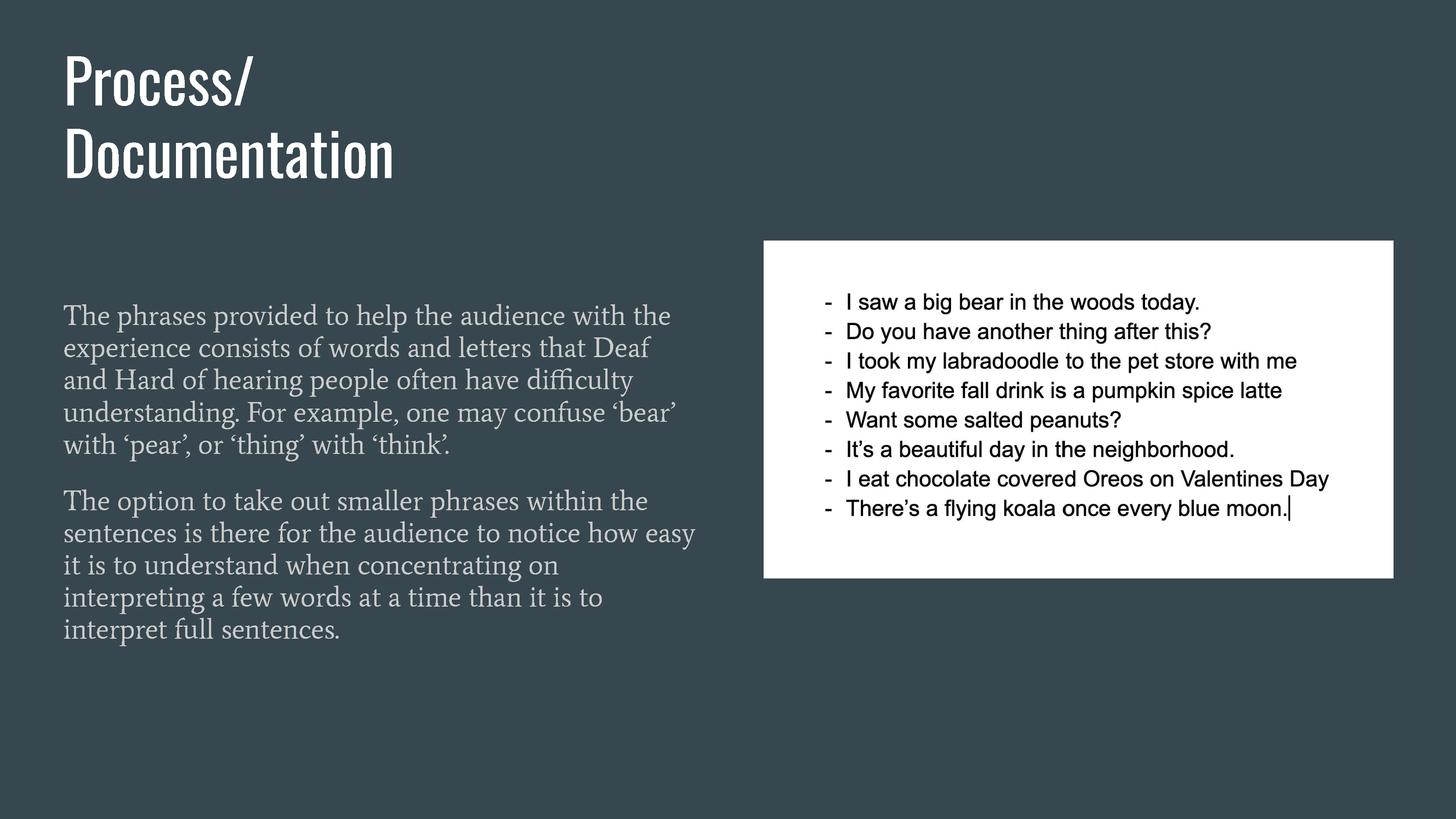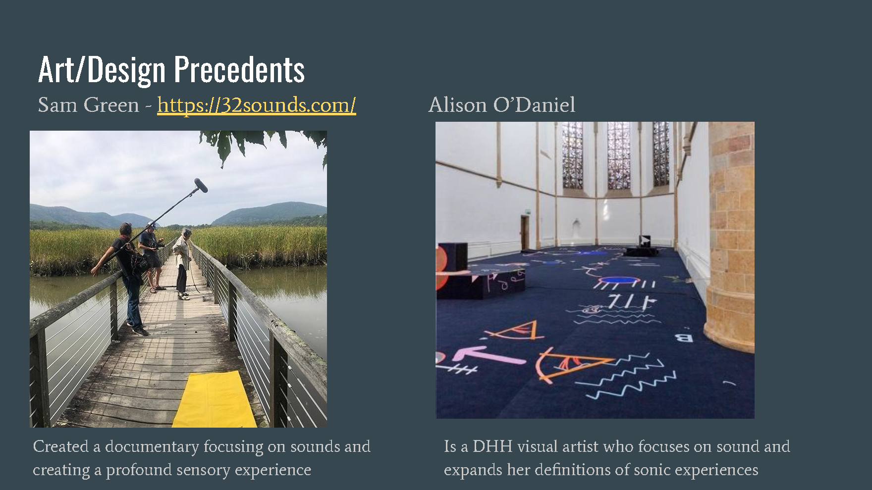 Visualizing Sound is a series of visual posters depicting the many different ways that DHH people interpret sound vibrations as well as comparing them to normal hearing people to inform the public about communication not always being the same interpretation for everyone.